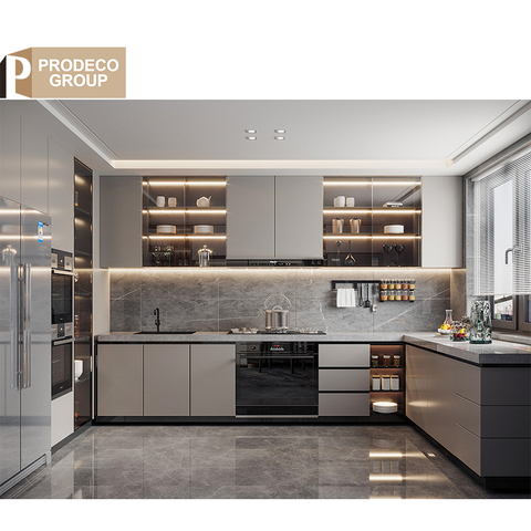 Prodeco商業金属モジュラーキッチンキャビネットデザイン家具サプライヤーエレガントなグレーキッチンキャビネットプロジェクト